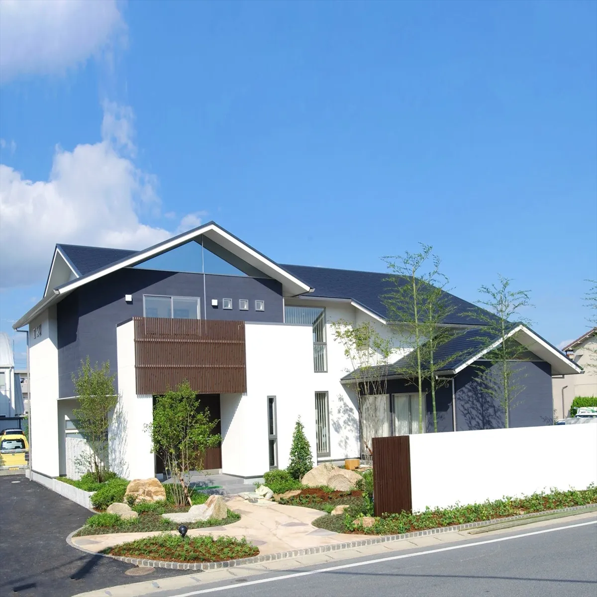 さらに、白と濃紺の壁が絶妙なコントラストを生み出し、木製のフェンスが加わることで、全体として洗練されつつもクールで引き締まった印象に仕上がっています🪵。家のデザインのセンスが光る、そんな一軒に住むことができたら、毎日が特別な日になりそうです✨。