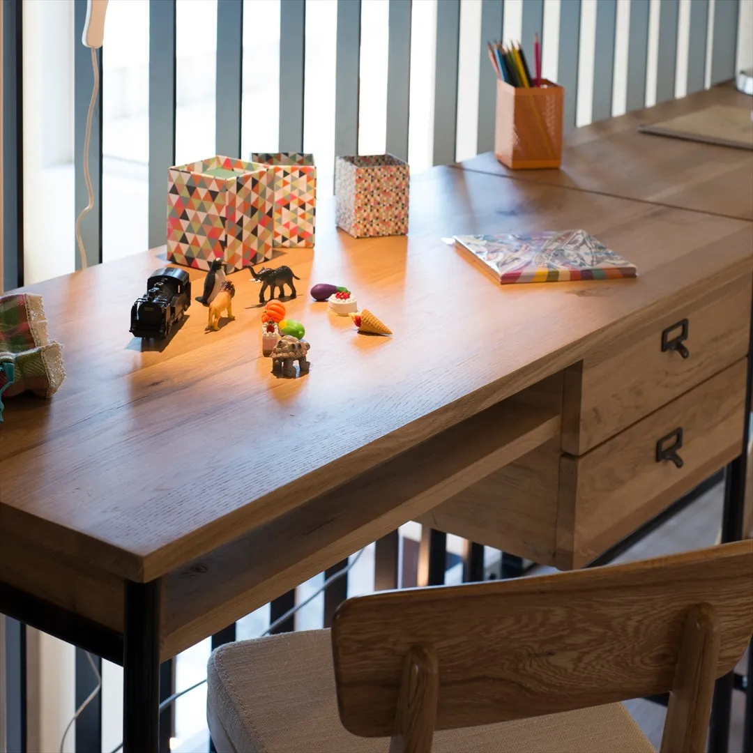 この机は、木の風合いが生かされていて、シンプルでナチュラルなデザインが魅力的✨。暖色のライトが照らすと、なんだかノスタルジックな雰囲気が漂いますよね。