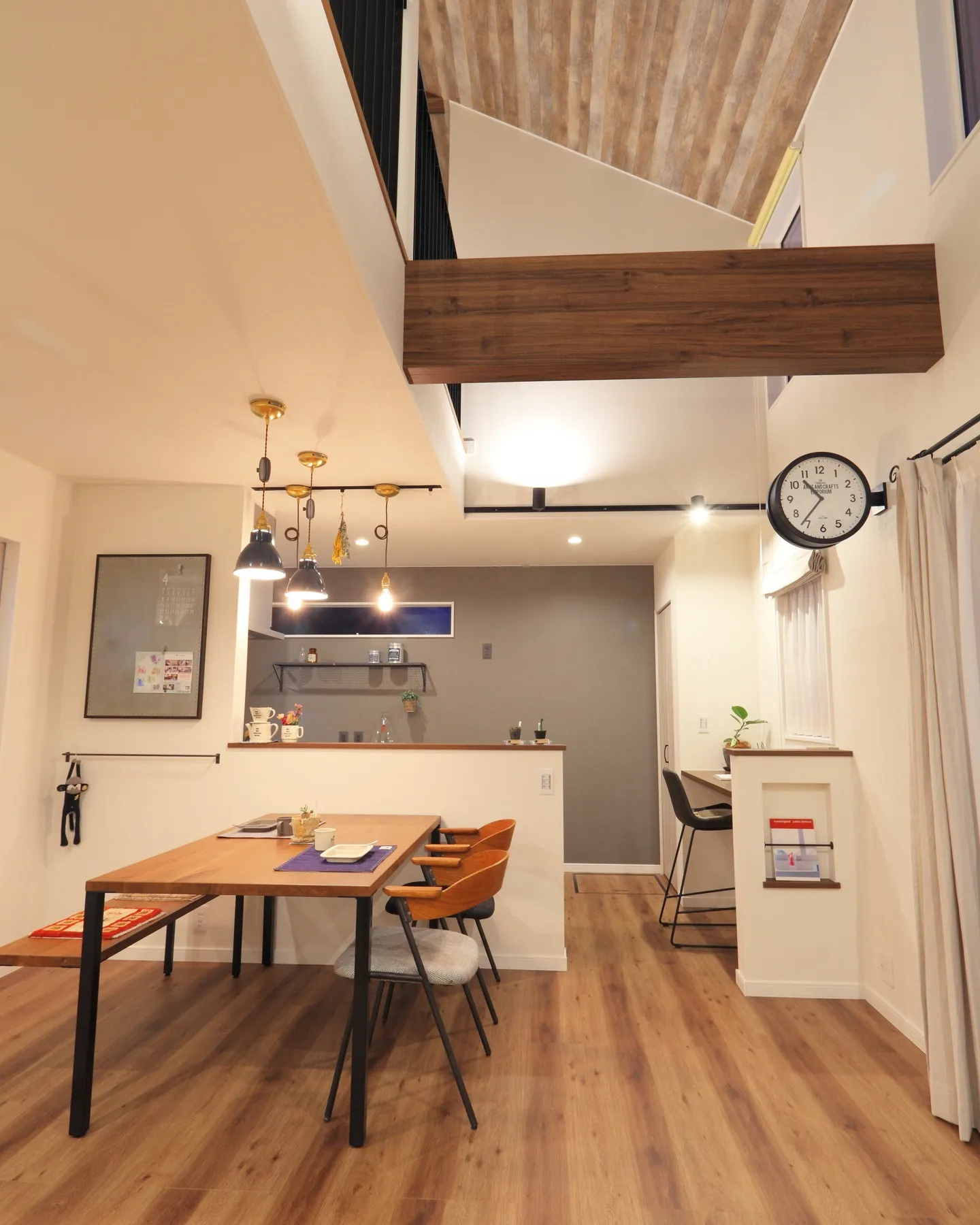 ペンダントライトの光が柔らかく木目に反射して、まるで森の中にいるような落ち着いた雰囲気。友達や家族が集まれば、話も自然とはずむし、料理も楽しくなりそうですね🍽💕