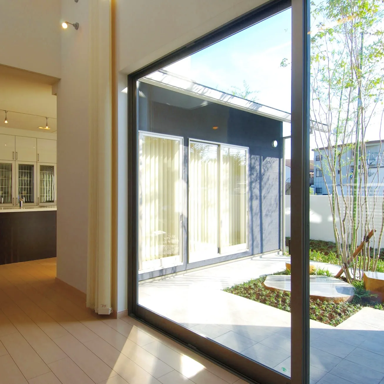 中庭に面した大きな窓から、日光がさんさんと降り注ぐダイニングキッチン☀️。その光のおかげで、明るくて開放的な空間が広がり、心までパッと晴れる感じです✨。大きな窓越しに見える中庭の緑🌿は、自然の美しさを存分に楽しむことができ、日常のストレスを忘れられますね。