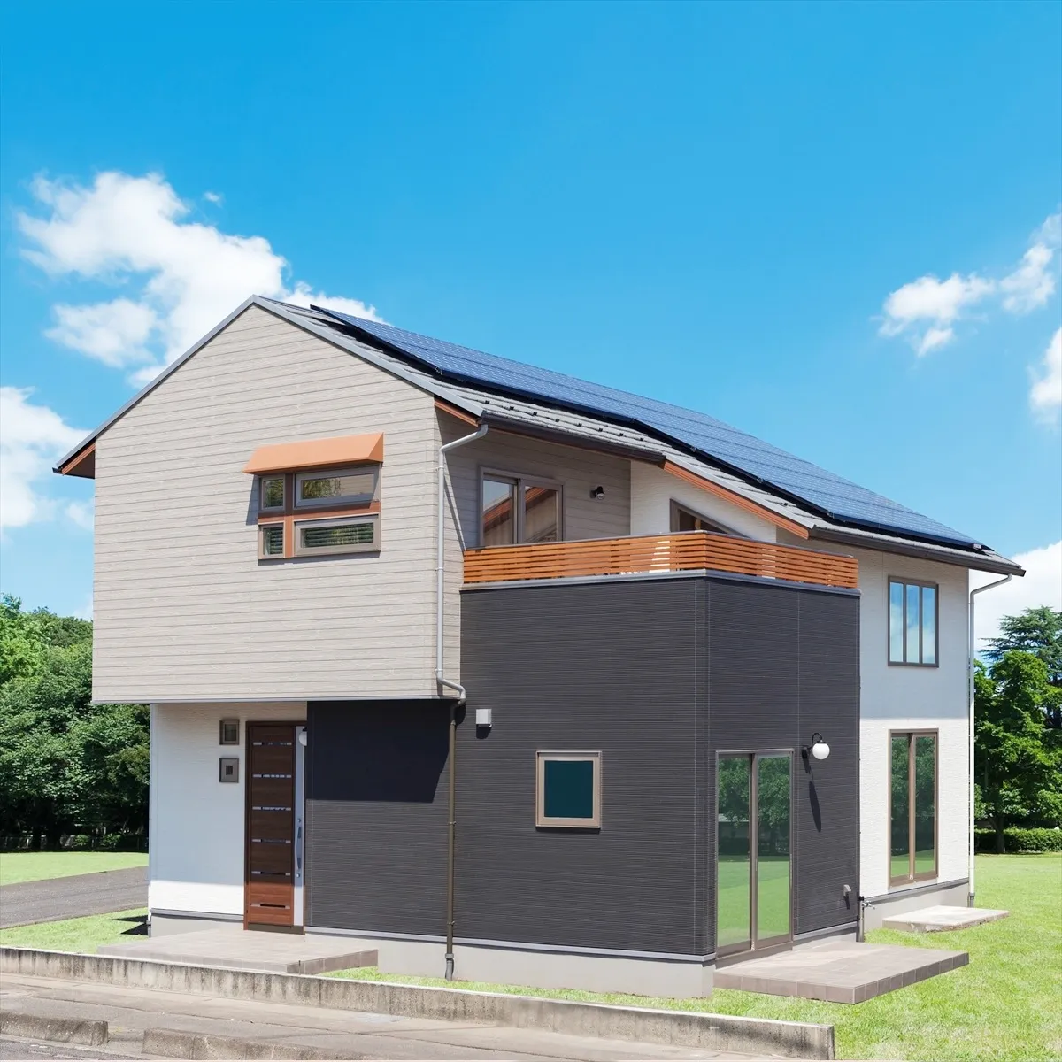 青空を背景に、美しい芝生の上にたたずむこの家🏡。スタイリッシュなシルエットが目を引きます。黒とグレーのツートンカラーの外壁は、まるでモダンアートのように、シンプルさの中にセンスが光っています✨。切妻屋根も美しく、全体のデザインに一貫性を持たせています。