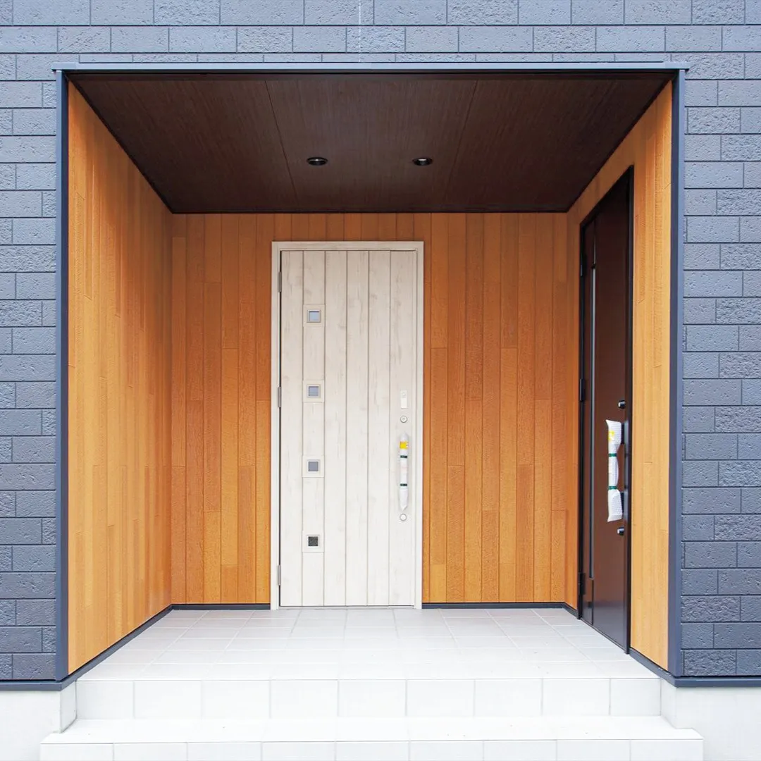 チャコールグレーのレンガ風外壁に、木の風合いを生かした玄関ポーチとドア。どっしりとした安定感とナチュラルな温もりが両立し、まさに「家の顔」としての存在感が際立っています✨